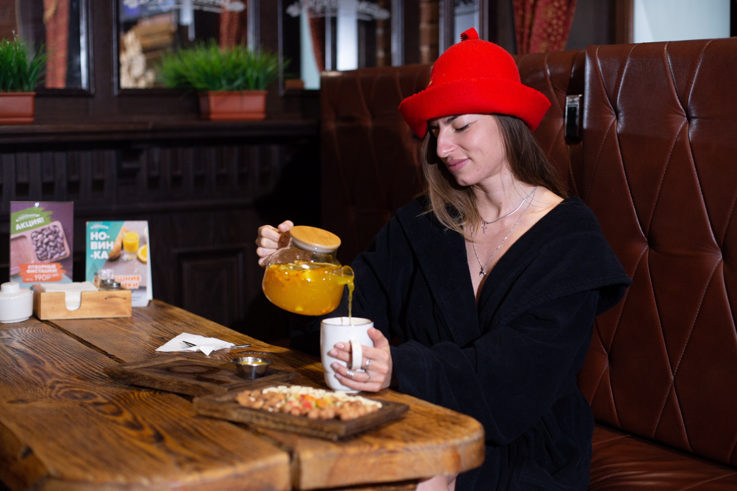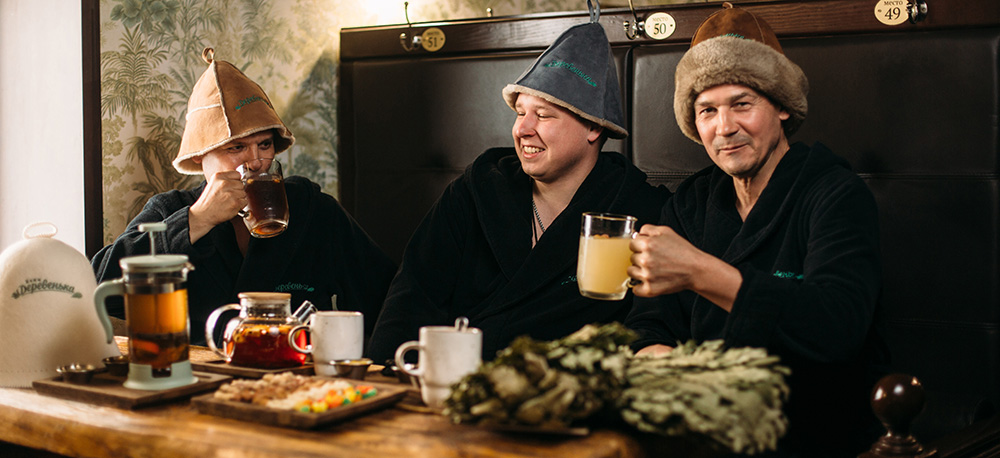 Комфортные посадочные места для каждого гостя. Зал отдыха с авторскими мягкими сидениями из натуральной кожи и массива дерева. Полное ресторанное обслуживание, профессиональные парильщики и массажисты. Просторная общая парная на дровах. 2 Парные для индивидуальных парений. Мыльное отделение: душевые, 2 кедровые купели с прохладной проточной водой, обливные устройства для контраста. Гардероб с индивидуальными шкафчиками.